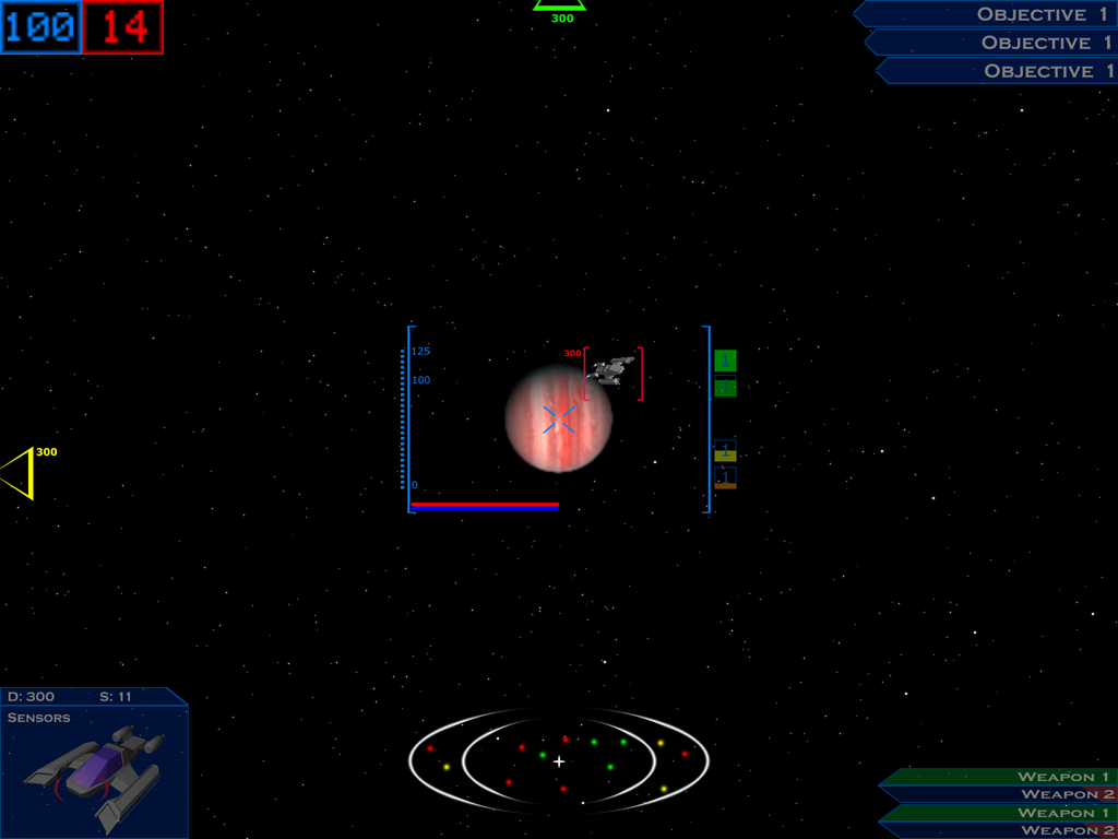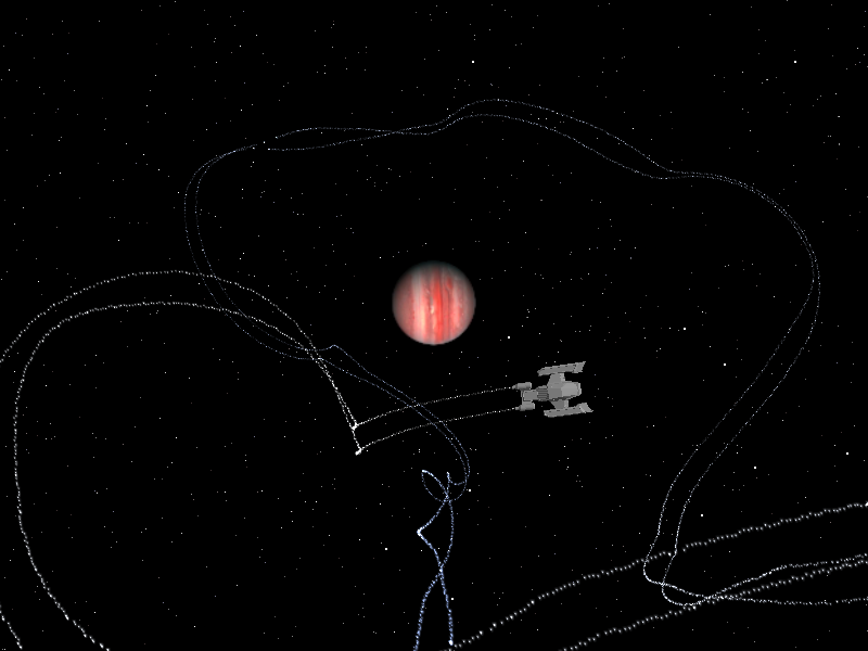 (11/11/03) Ok so it's been a while since we've put anything up here. I assure you this is certainly not because work has come to a standstill. Almost everything in the back end is in place, including a full Python interpreter to use on console and as our mission/game/menu scripting language. The world implementation is coming along nicely, and input is MUCH much cleaner. Menu system classes have been written, and entity classes flushed out quite a bit as well, and much much work has been done (and then promptly thrown away and started over from the beginning) in missle and general navigational AI. Thing is, this is all back-end stuff that doesn't make very good content for a screenshots page, but very necessary for the game itself. Anyways, collision detection is almost a reality! We finally have it working in the one-rectangle case, which is actually (more than) half the battle. Now we just need to reproduce this about 1,000,000 times and we're set. This screenshot is a composite taken over 10 frames showing the collision detection in action.