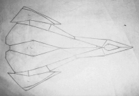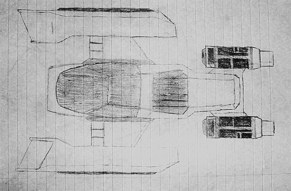 My friend Tony drew this up for us, seems pretty cool but difficult to model. The surfaces on this ship are a mix between solid panels and smooth curves. Definitely a very cool ship, might have to wait until our modeling skills improve a little bit though. Also something to note is Tony drew this whole thing BY HAND with no ruler or anything. And he didn't even fold the paper to get the symmetry right. Impressive.