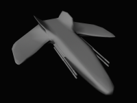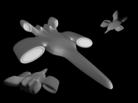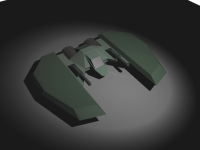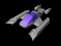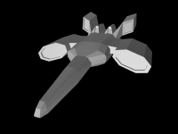 (10/04/03) So it turns out hitting the ``smooth'' button in Maya on Ted's ship from yesterday (with a few minor changes...) gives us this awesome-looking ship. The poly count is up around 5800 (heh) but we can work on getting that number down I'm sure.